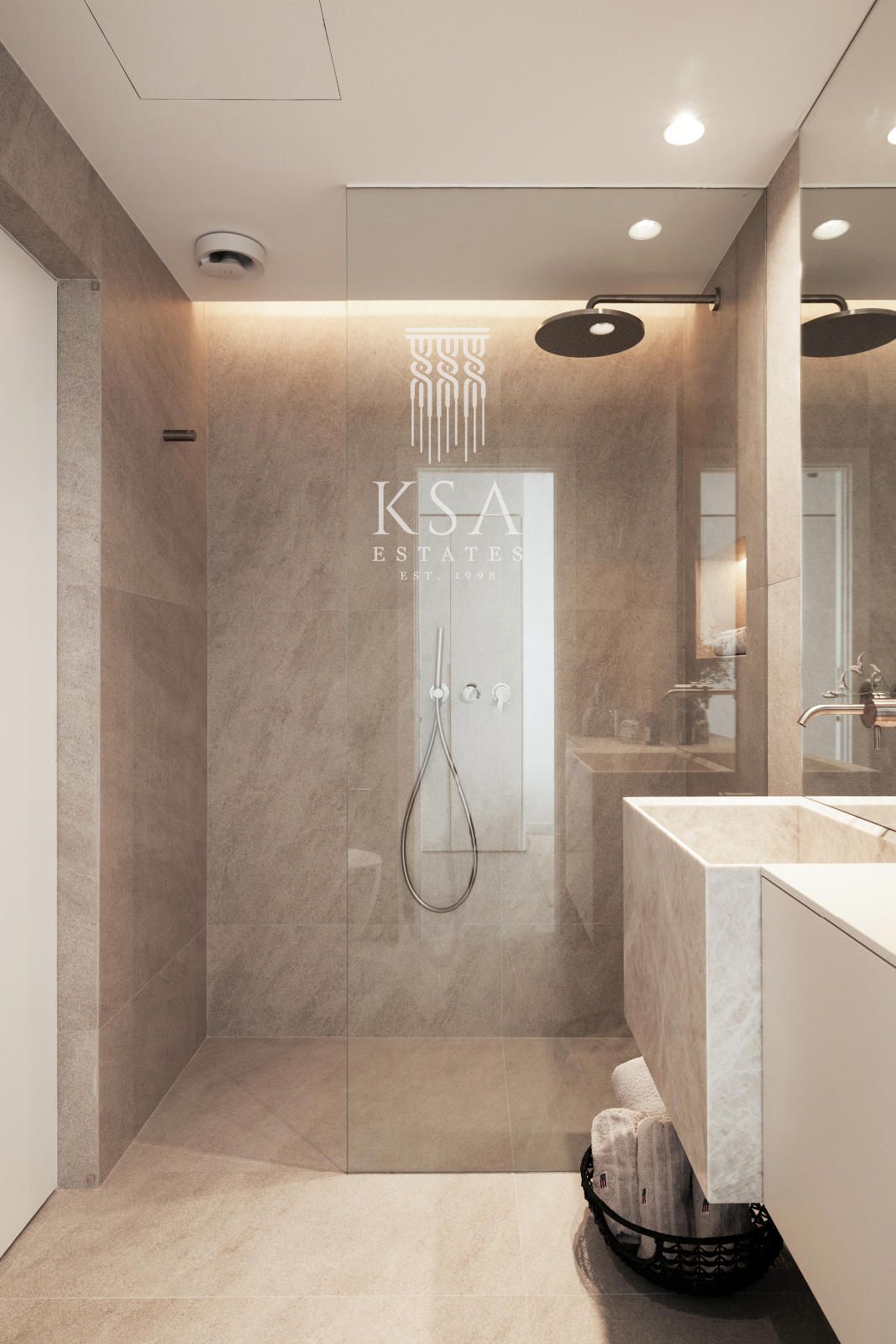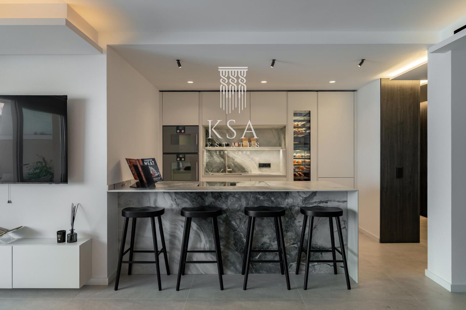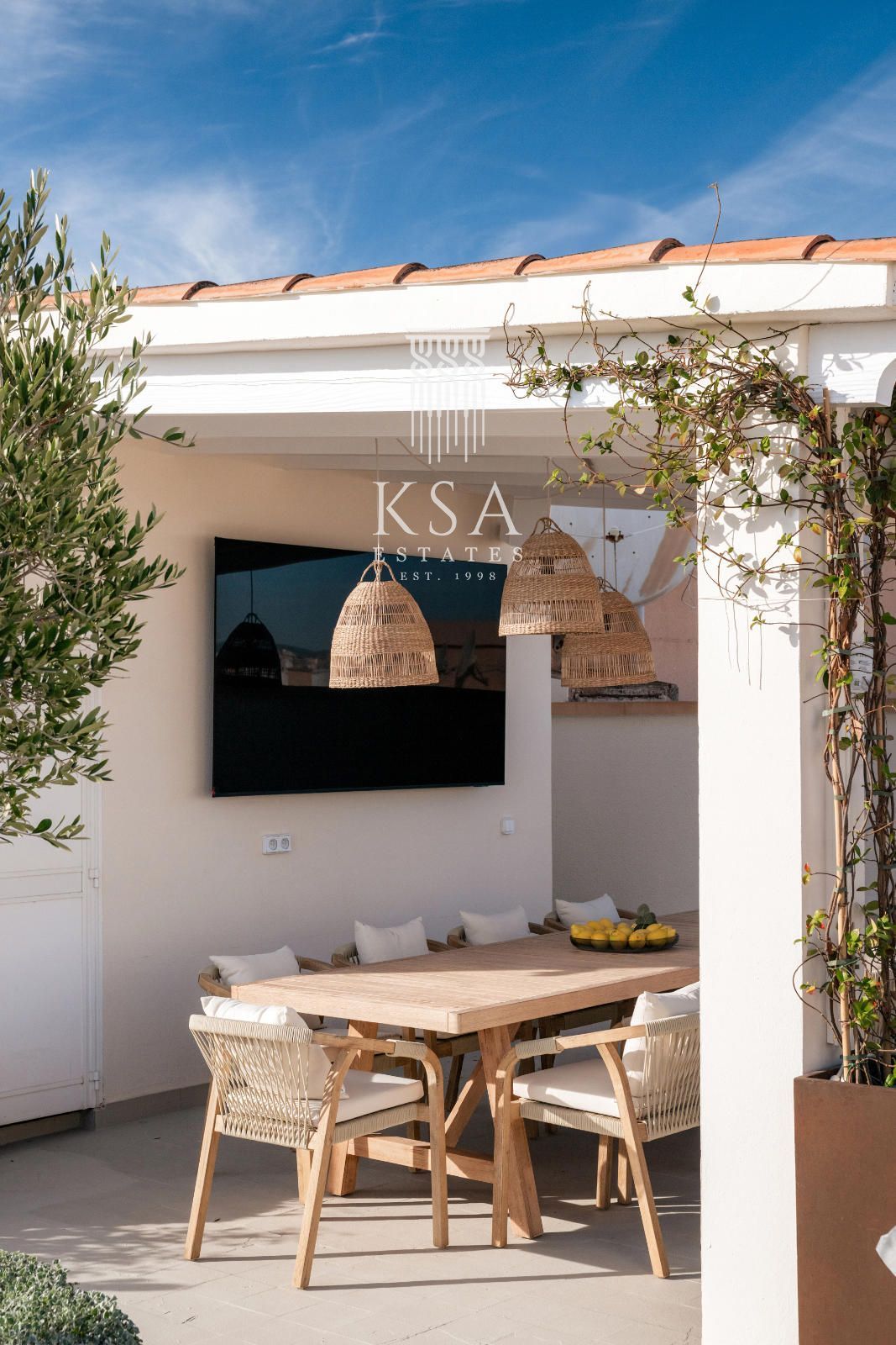 La distribución, cuidadosamente diseñada, cuenta con tres dormitorios, cada uno con baño en suite, garantizando confort y privacidad tanto para residentes como para invitados. Un aseo de cortesía, elegantes suelos de mármol y una cocina totalmente equipada de la marca Gaggenau refuerzan la sensación de calidad en toda la vivienda.